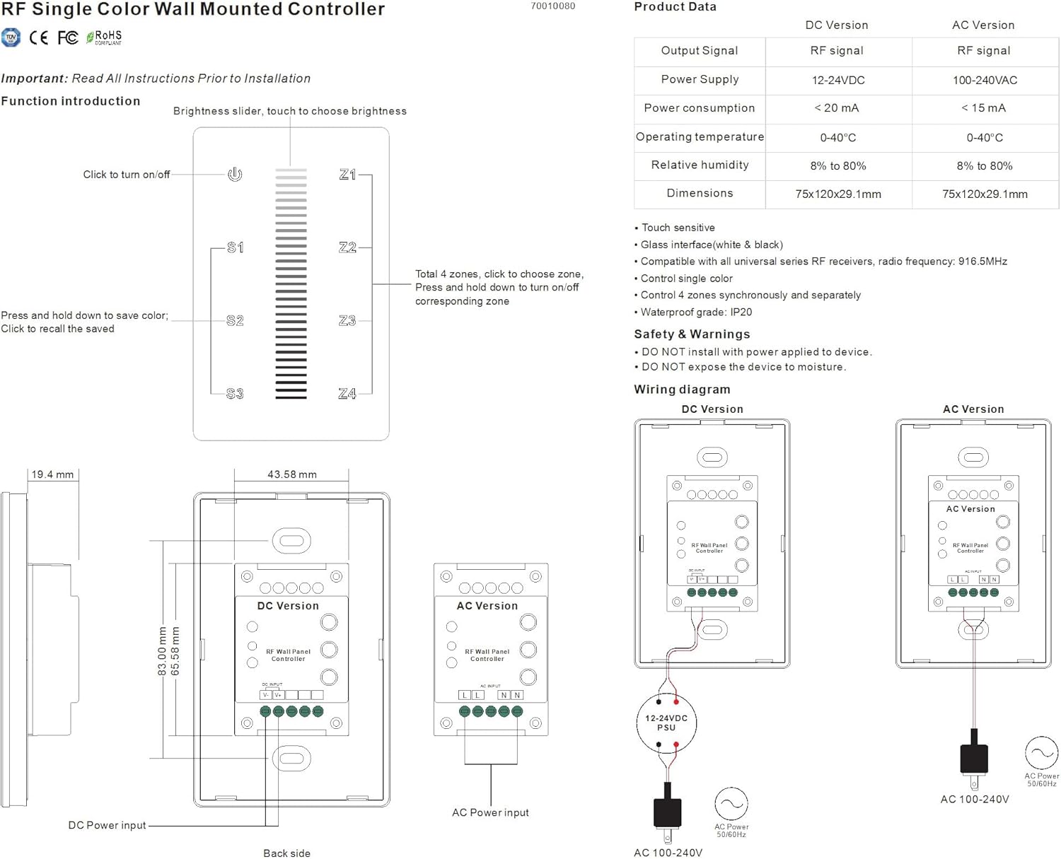 About this item Adopt a high precision capacitive touch IC Magnetic installation 2.4G RF wireless transmission technology Support MiBoxer/Mi-Light 2.4G series Control distance: 100Foot Brightness and color temperature adjustable